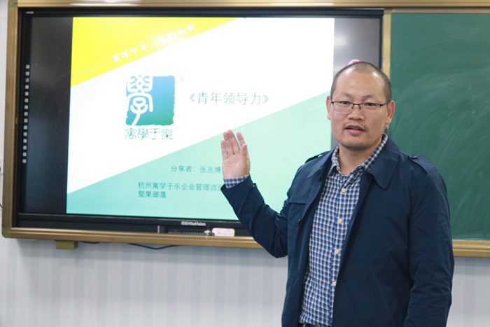 开班仪式上,杨立乾就青年领导力研习营的背景、内容、目的和要求等方面做了简单介绍。并用具体生动的例子生动讲解了领导力的价值及重要性。现场与杭州寓学于乐公司签署校企合作协议,并为首届研习营导师张兆博颁发聘书。