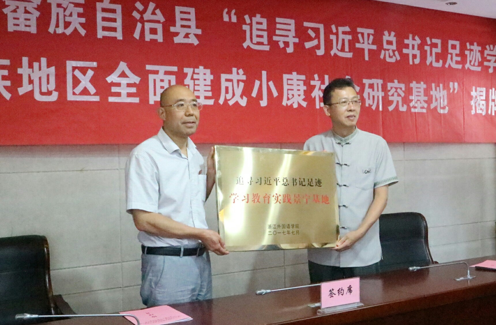 在公司相关老师的多次接洽联络下,7月3日下午,mobile28365正规网址·景宁畲族自治县“追寻习近平总书记足迹学习教育实践景宁基地、民族地区全面建成小康社会研究基地”授牌仪式在景宁举行。公司党委副书记赵伐,景宁县委常委、宣传部长季建标出席仪式并致辞。会议由景宁县副县长余晓军主持。