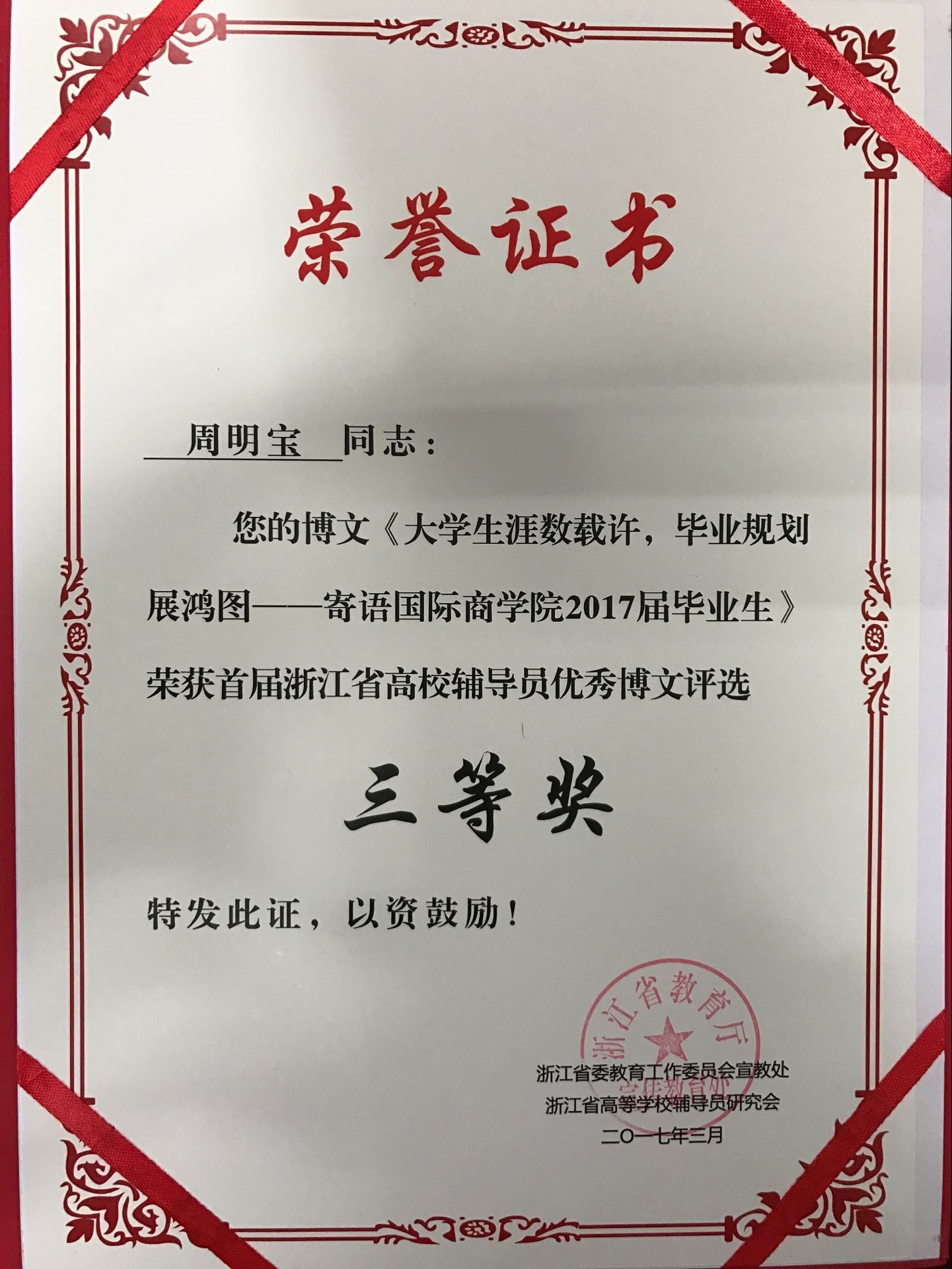 由浙江省教育厅宣教处指导,浙江省高校辅导员研究会、《高校思想政治工作》杂志社、“浙群辅导员”新媒体工作室主办的首届浙江省高校辅导员优秀博文评选结果出炉。公司党总支副书记周明宝的《老员工涯数载许,毕业规划展鸿图——寄语国际商公司2017届毕业生》荣获三等奖。