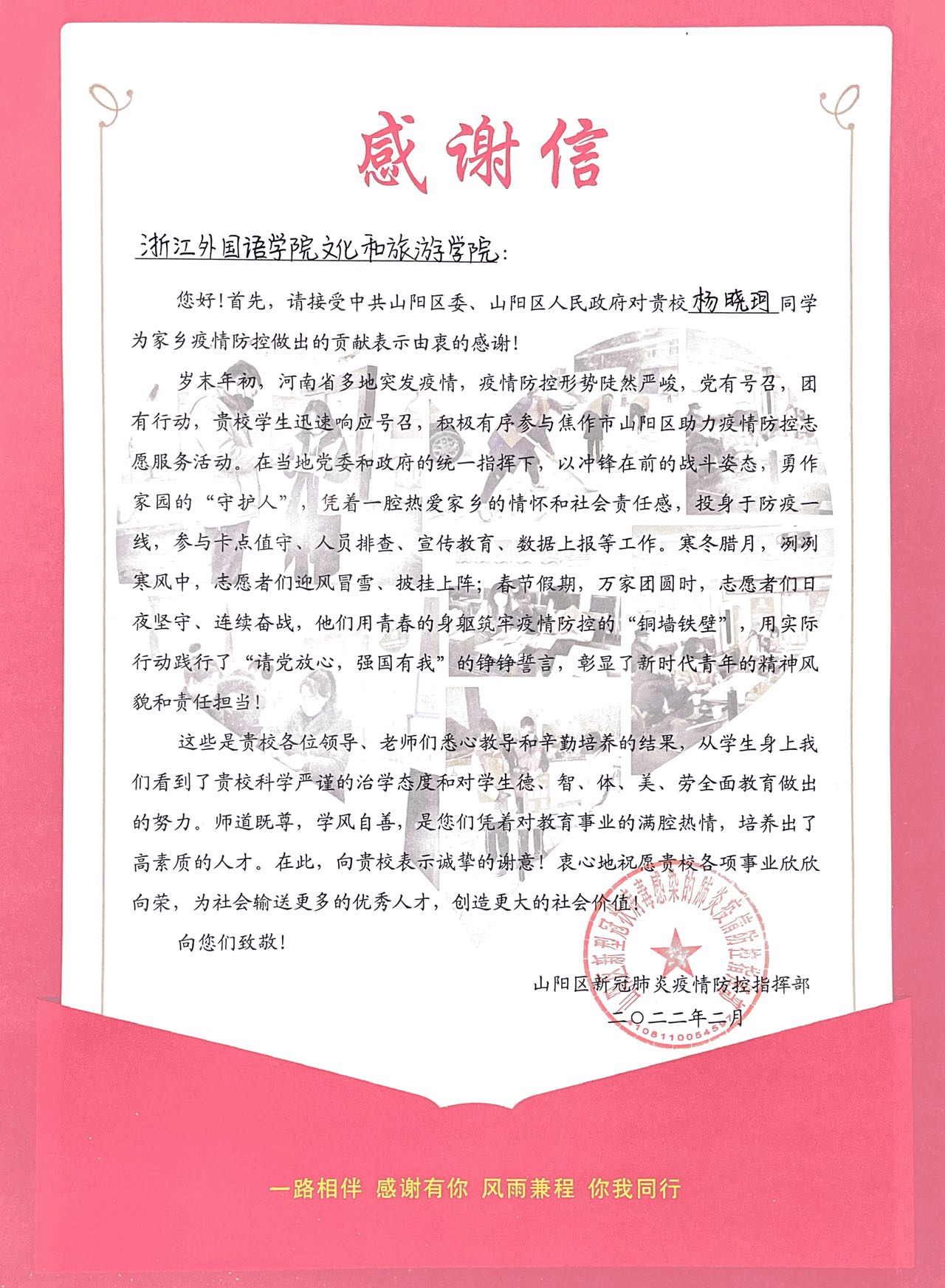 近日,河南省焦作市山阳区新冠肺炎疫情防控指挥部给公司发来感谢信,对公司19旅管1班杨晓珂同学为家乡疫情防控工作做出的贡献表示感谢,对公司青年员工志愿者的奉献精神和优秀品质表达崇高敬意。这是对​公司员工志愿服务家乡、奉献青春担当工作的肯定,也是对​mobile28365育人成果的肯定。