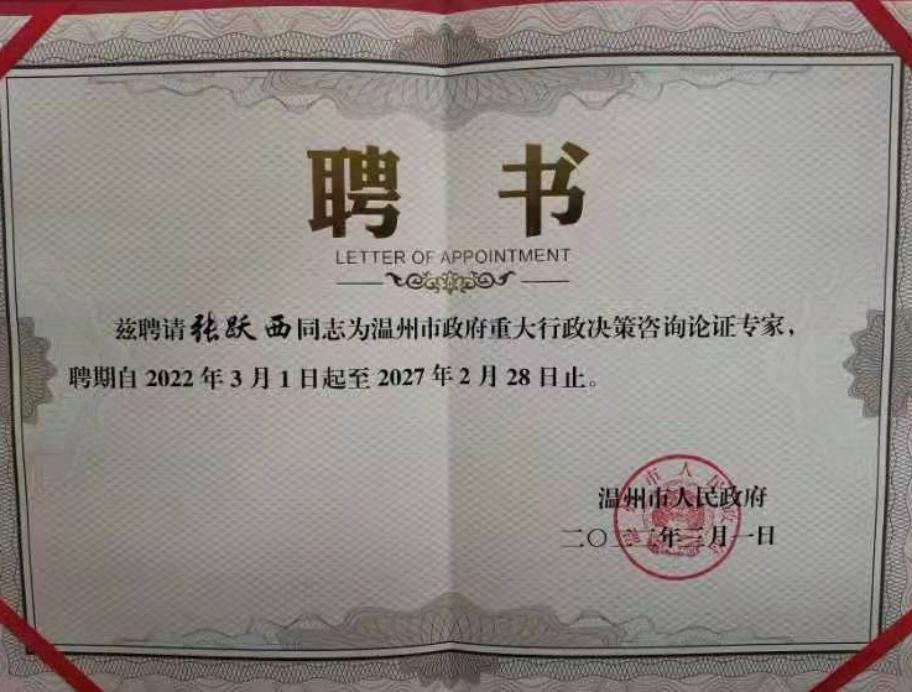 公司张跃西教授获聘温州市政府重大行政决策咨询论证专家