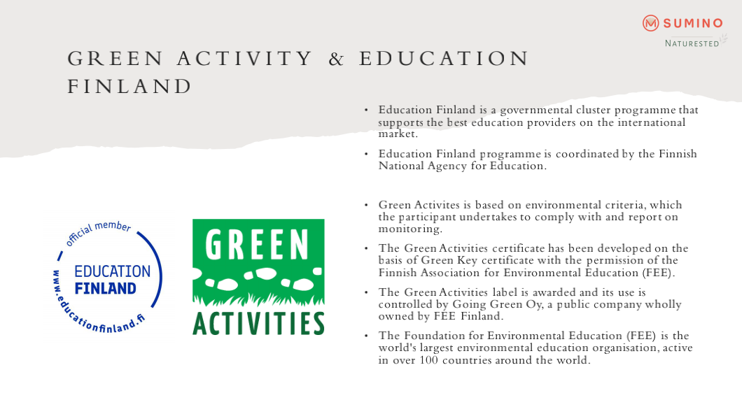 芬兰自然教育研学培训项目由mobile28365主办,芬兰書米国际教育有限公司和Finland International Education共同负责,包括资源对接、外教管理、课程内容、培训测评和证书颁发等。项目旨在帮助同学们了解和学习芬兰自然教育体系、学会如何开展自然与户外教育以获得较为全面的自然教育专业知识。营员们不仅可以通过此次培训获得全外语学习专业课程的经验,还可以在培训项目结束时获得Green Activity和芬兰教育部颁发的自然教育认证,为这个暑期注入学习与证书双丰收的别样体验。