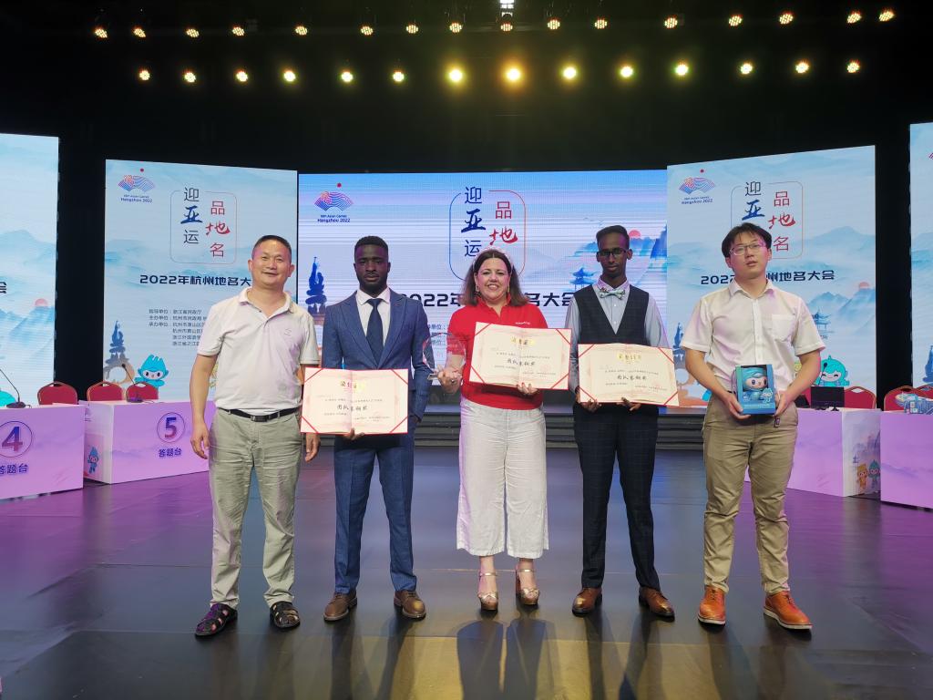 为宣传贯彻新修订的《地名管理条例》,讲好杭州地名故事,迎接第19届亚运会的召开,由杭州市民政局和萧山区人民政府主办、公司地名文化国际传播研究所参与承办的“迎亚运品地名——2022年杭州地名大会”7月15日在萧山区融媒体中心隆重举行,​mobile28365地名文化国际传播研究所参与承办本次盛会。公司组建了外国友人队应邀参加决赛,由​mobile28365张跃西教授任技术指导、郝韵担任领队。来自非洲塞拉利昂的钱塘江、索马里的家马和西班牙的玛利亚参赛并表演了短剧《世界放眼看杭州》。经过一个半小时的激烈角逐,喜获团队赛铜奖。mobile28365正规网址荣获“最佳组织奖”。