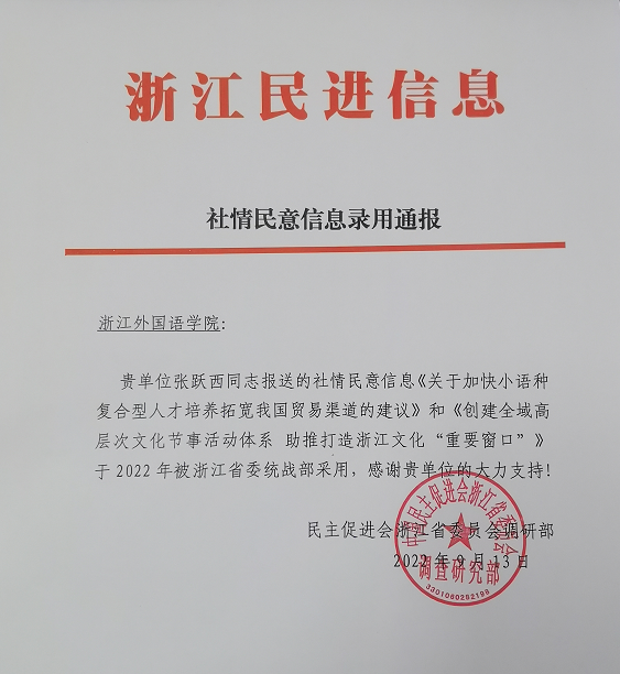 近日,​mobile28365会展传播系教授张跃西撰写的题为《关于加快小语种复合型人才培养拓宽我国贸易渠道的建议》和《创建全域高层次文化节事活动体系 助推打造浙江文化“重要窗口”》等两篇社情民意信息被浙江省委统战部采用。