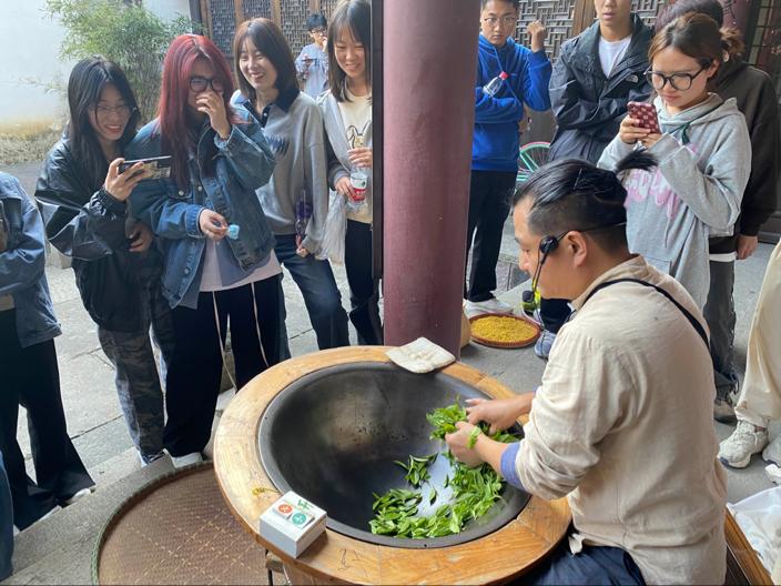 生动的户外学习过后,同学们来到画外桐坞观看学习制作桂花茶、炒龙井茶,并主动参与现场教学,积极互动。