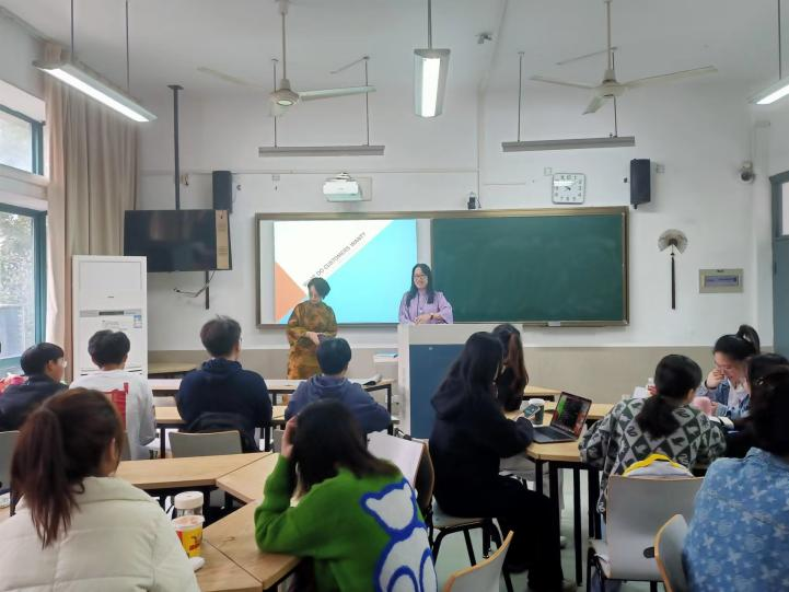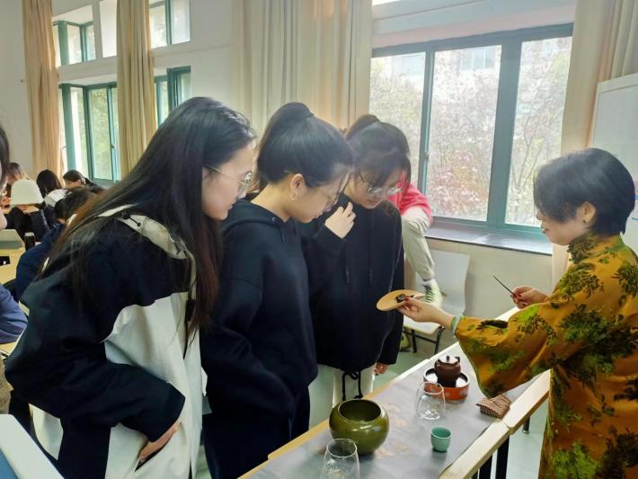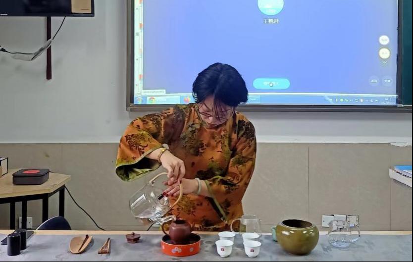 在课上卢珊女士与蒋艳老师都身着旗袍,正式上课前,以现场茶艺制作的形式来营造出了富有“茶香、墨香”的课程场景,让同学们身临其境地感受到茶文化的场景感。