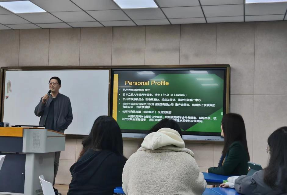 潘丹先生目前在杭州市商旅集团(运河集团)的投资发展部主持工作,也是浙江省文化和旅游资源开发专家,之前是杭州水上发展集团有限公司的董事长。潘丹部长本科毕业于杭州大学,并在日本立教大学获得了硕士和博士学位。潘部长曾负责杭州市三江两岸系列规划、杭州市城市旅游专项规划等,也曾参与杭州市旅游宣传片、杭州市绿道体育的开发和管理等,并发表过多篇论文、出版过多本著作,具有丰富的旅游管理经验和学术功底。讲座由国际文旅系蒋艳老师主持。