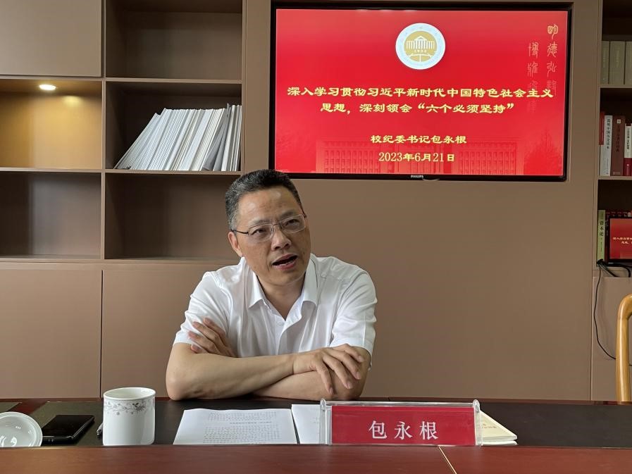 6月21日,校纪委书记包永根参加​mobile28365理论学习中心组集中学习,并作了题为“深入学习贯彻习近平新时代中国特色社会主义思想,深刻领会‘六个必须坚持’”的领学。学习会由公司党总支书记范芸芸主持,公司理论学习中心组成员参加。