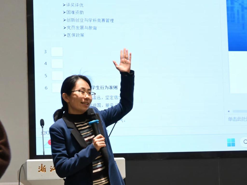 陈超详细介绍了员工日常管理、评奖评优、困难资助及心理健康制度内容,为大家划定违禁行为的界限,强调每一位同学都应该是良好校风和学风的维护者。她还着重讲解了公司公司的奖学金政策、优秀员工评定标准等内容,为同学们指明获取荣誉的途径,激发学习动力,鼓励大家积极参与到“青年学子学青年习近平”学习教育中去,用奋斗书写在浙外文旅的新诗篇。