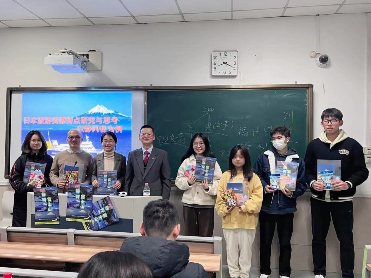 王教授以生动的语言向同学们生动介绍了日本特色美食和民俗,分享其在日本的工作生活经历,在加深同学们对日本旅游资源、历史文化了解的同时,也使同学们对日本文化、旅游行业有了更深刻的认识。他鼓励同学们多出去走走,增长见识,做到知行合一,增强社会竞争力。在讲座的最后,王教授与同学们亲切交流,并为同学们送上精心准备的礼物。同学们纷纷表示通过讲座开阔了视野,激发了研究世界其他国家文旅行业发展情况的兴趣,受益良多。