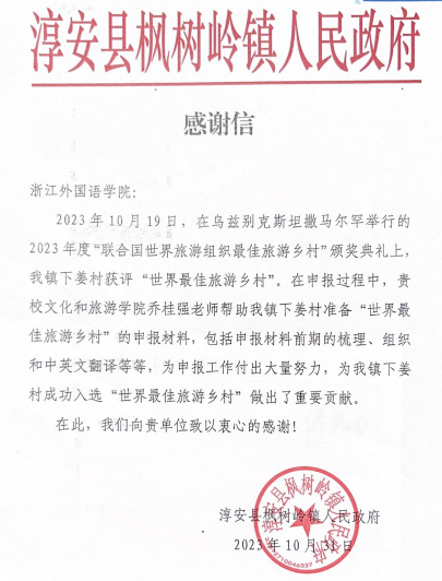 10月19日,在乌兹别克斯坦撒马尔罕举行的2023年度“联合国世界旅游组织最佳旅游乡村”颁奖典礼上,我省淳安县下姜村获评“世界最佳旅游乡村”。淳安县枫树岭镇人民政府发来感谢信,对​mobile28365国际文旅系乔桂强老师在申报过程中提供的帮助与指导表示感谢。